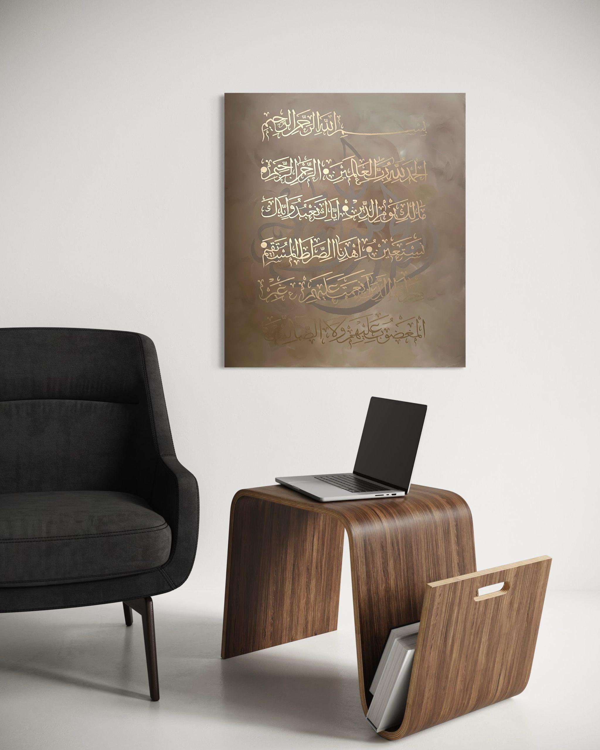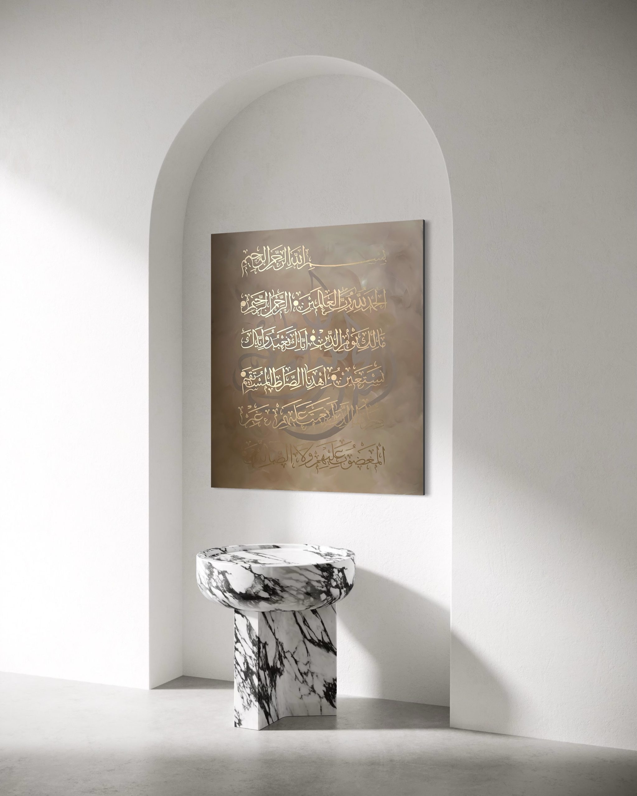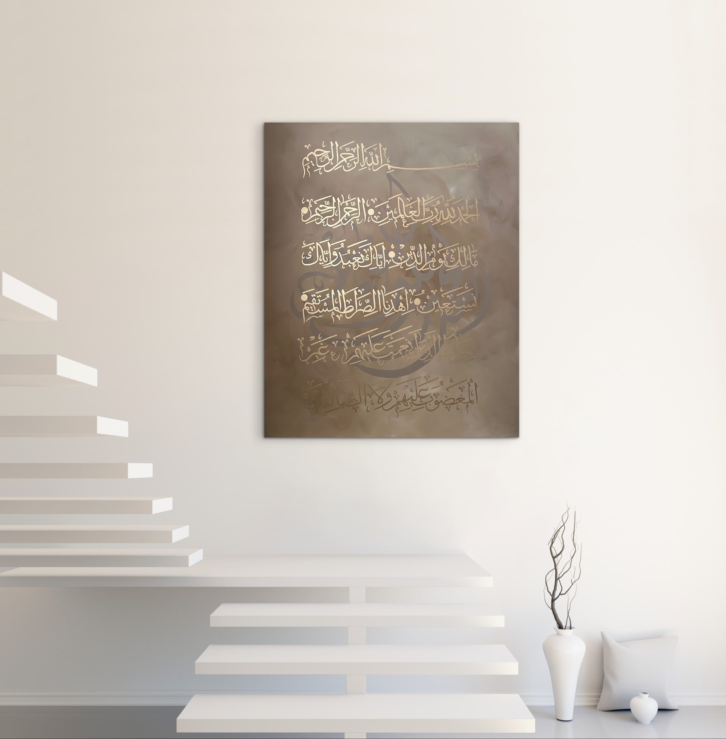 calligraphie d’arrière plan : « Louange à Allah, Seigneur de l’univers. » verset 2 – surah al fatiha