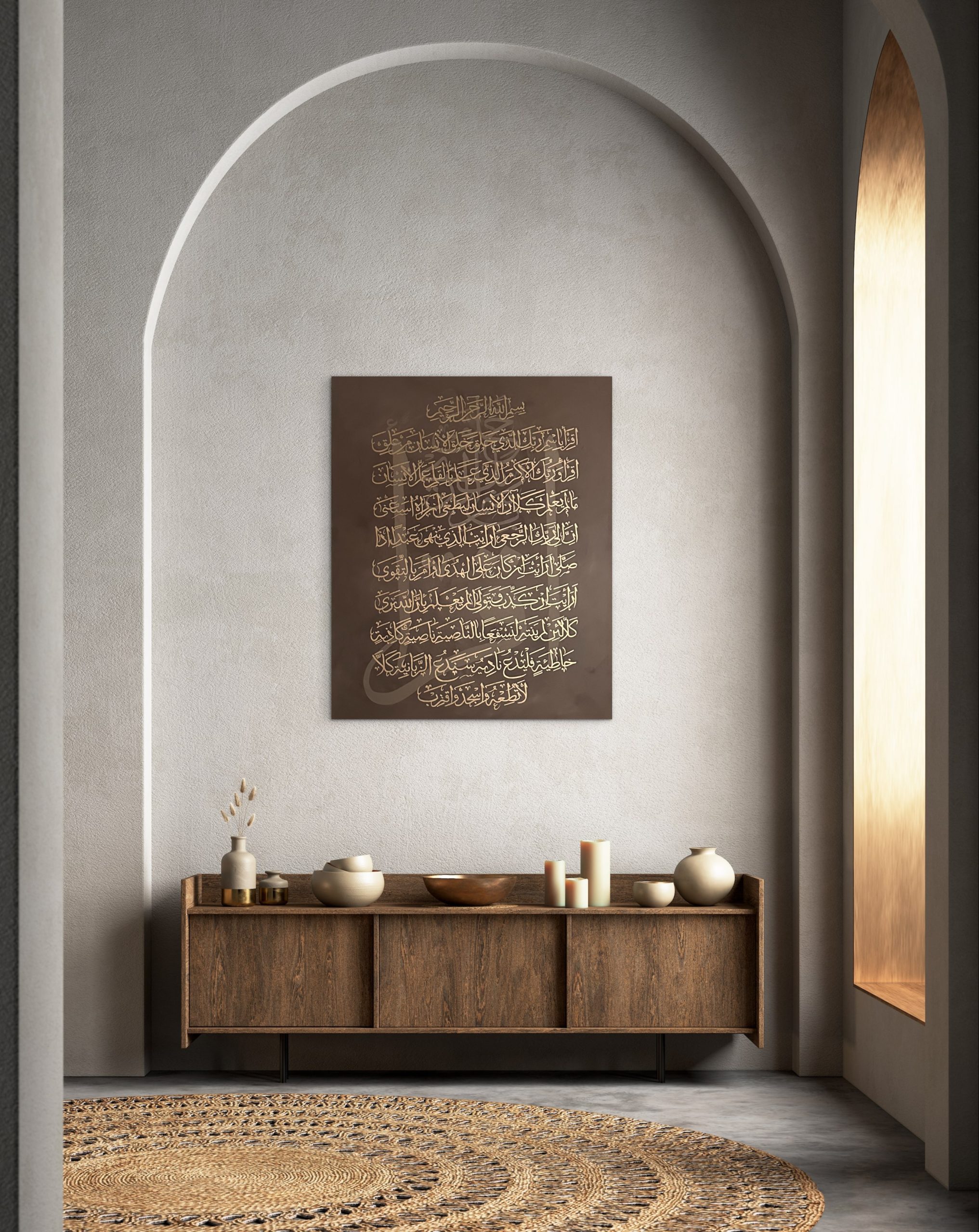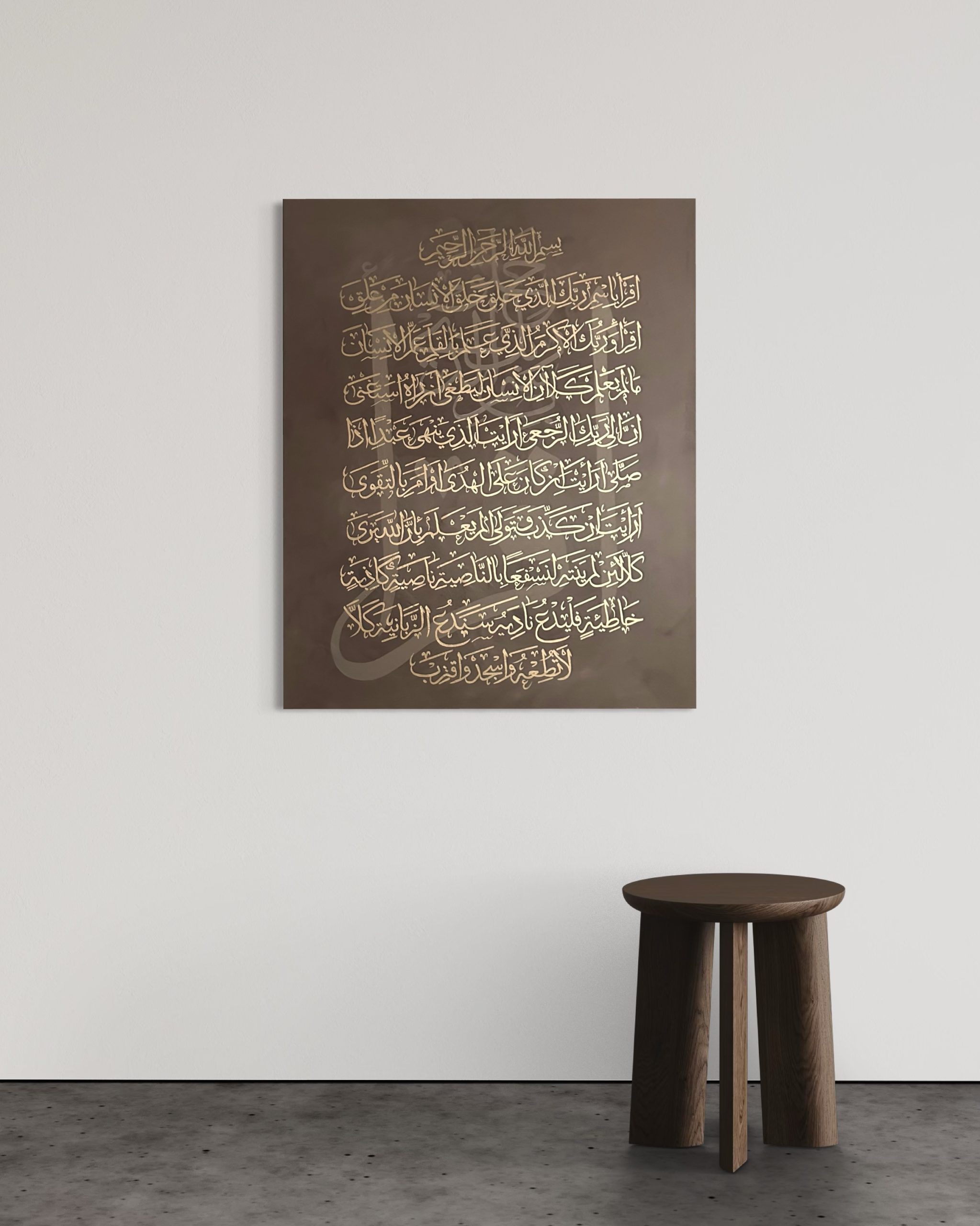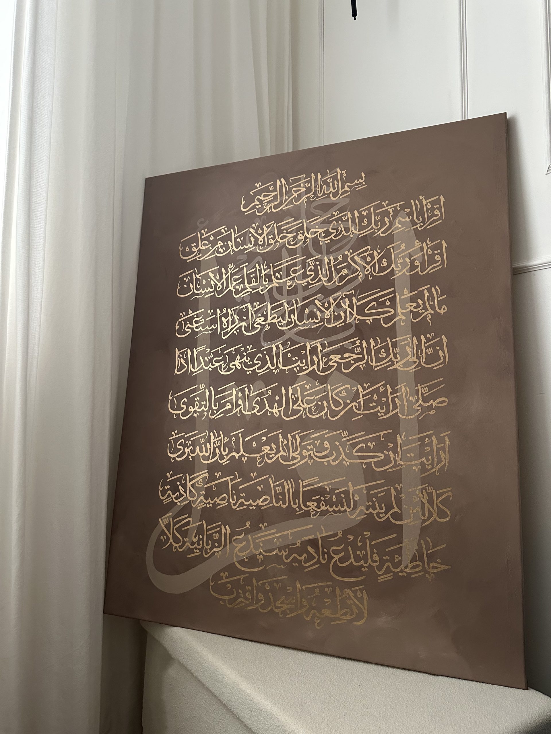 calligraphie d’arrière plan « Lis au nom de ton Seigneur qui t’a créé. » en référence au début de surah al ‘Alaq